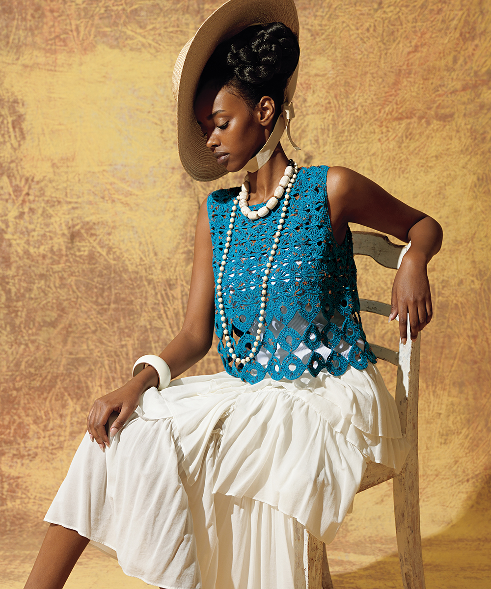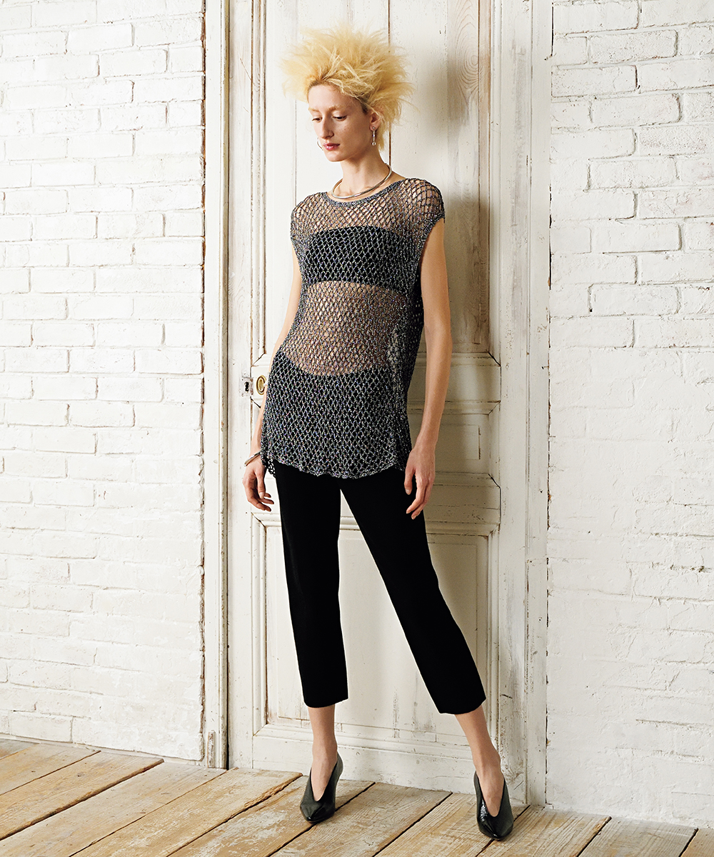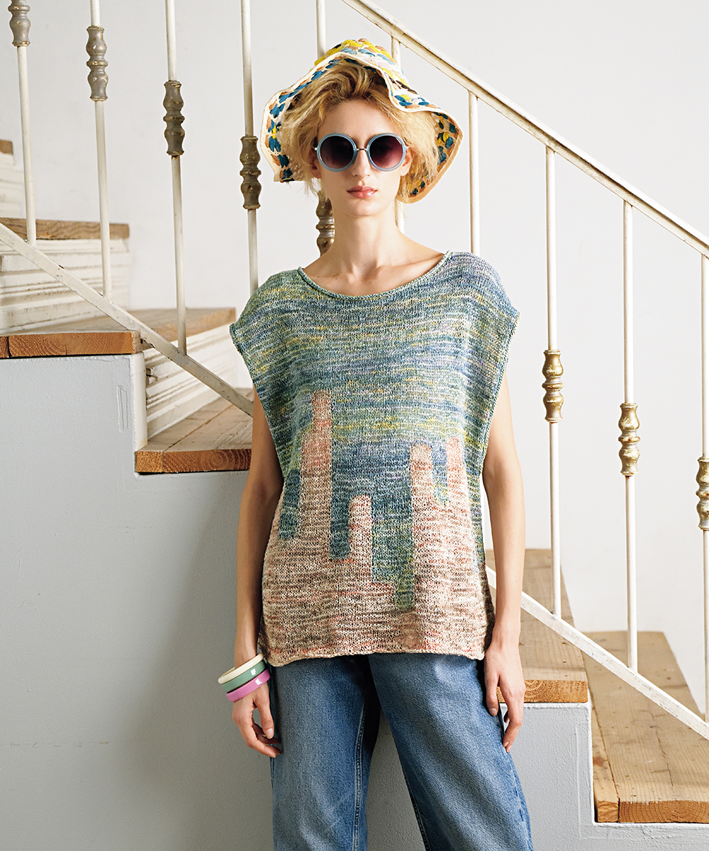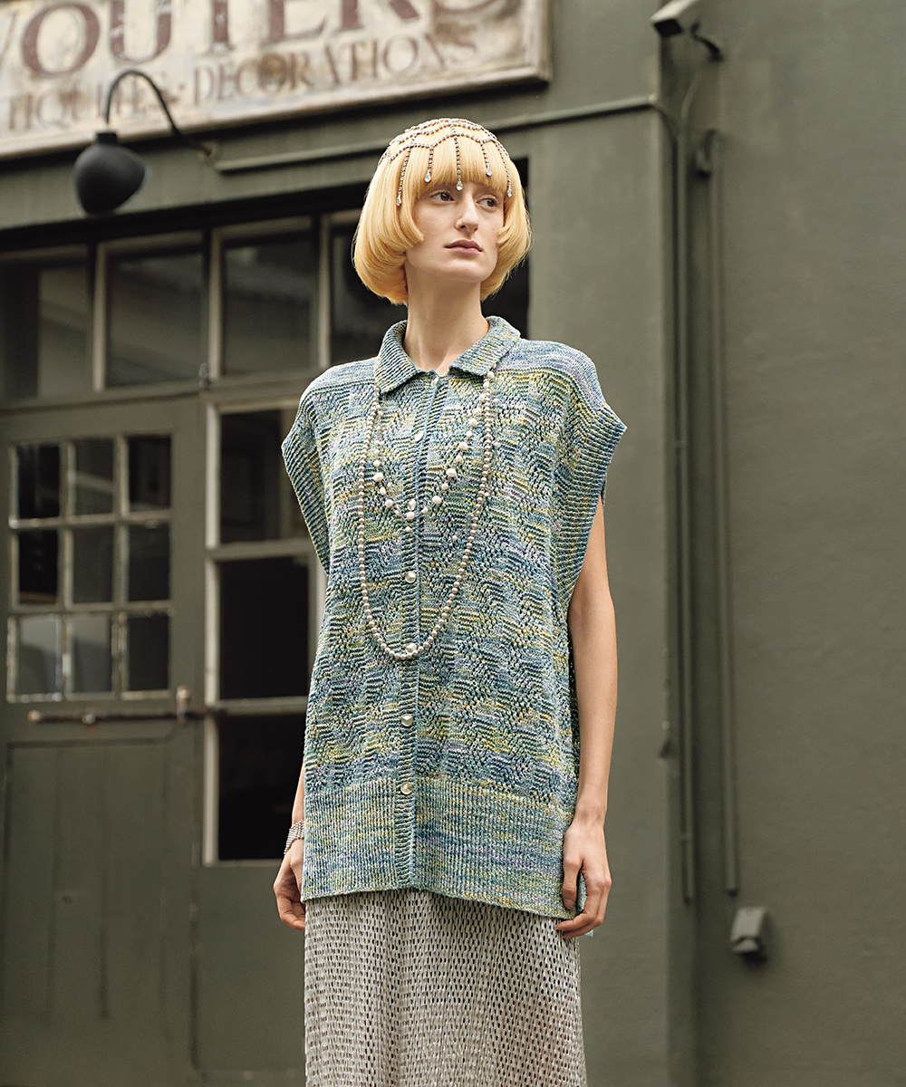 本章のウェア作品は、斜めや螺旋状の模様、糸色の変化でデザインに動きを与えました。