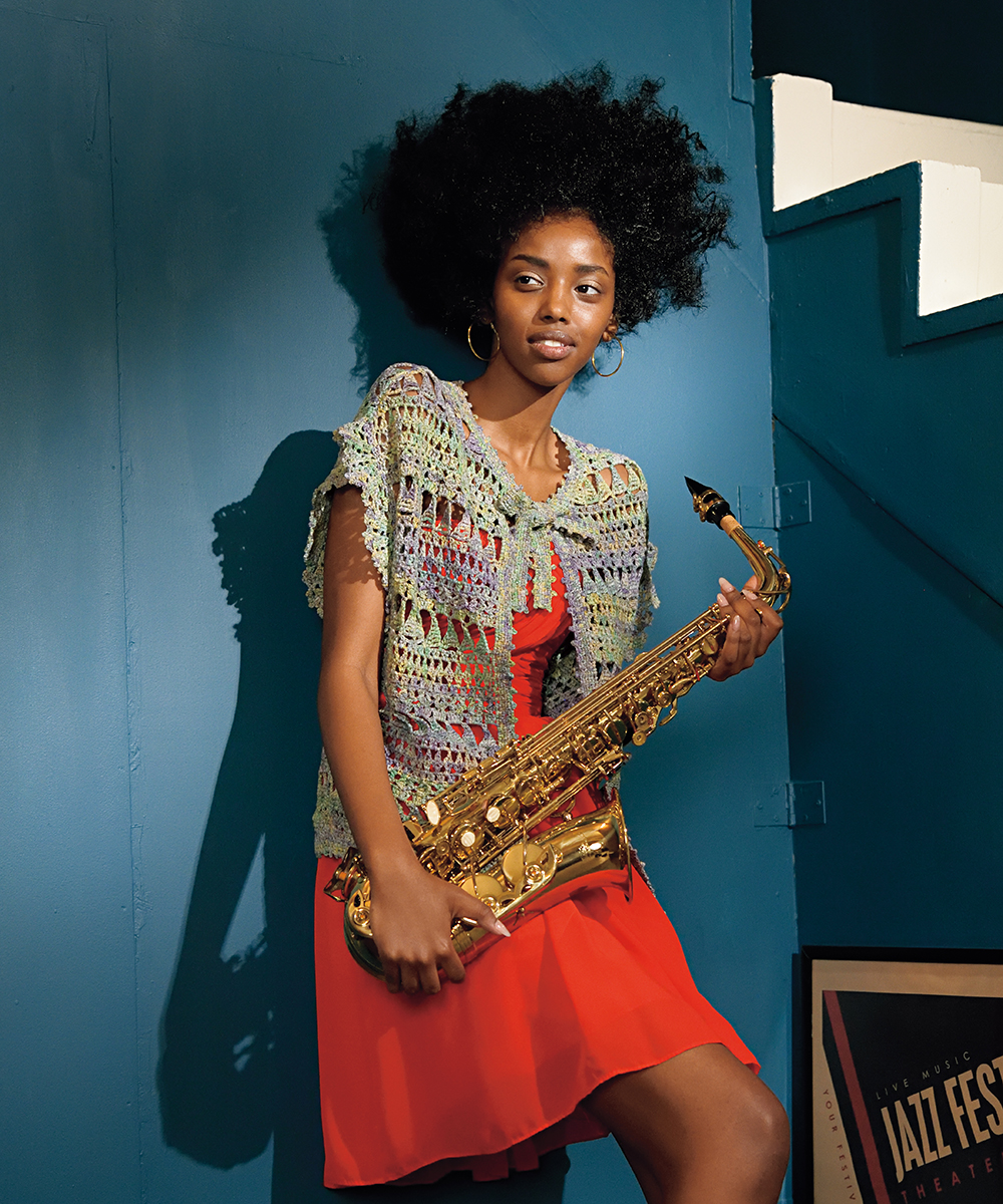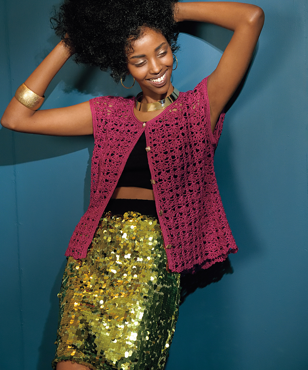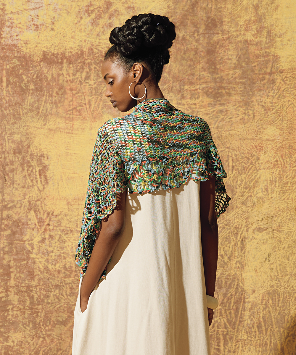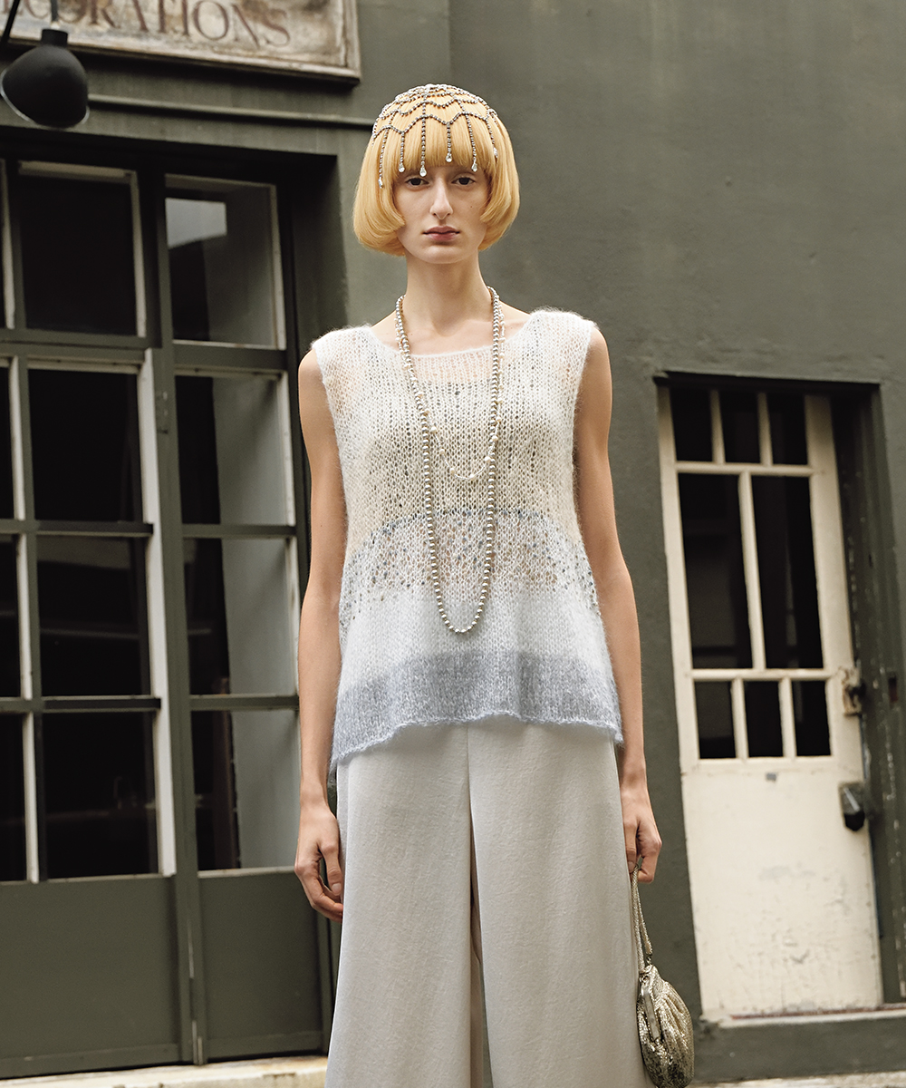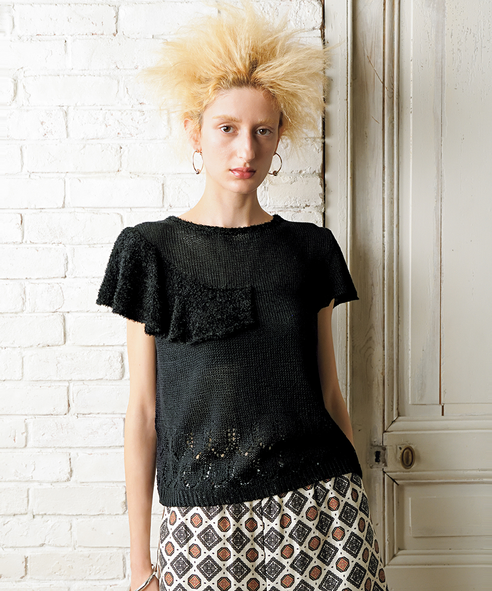 本章のウェア作品は、斜めや螺旋状の模様、糸色の変化でデザインに動きを与えました。