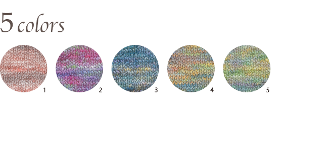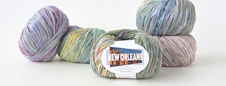 4色の染料をスプレー噴射して綿部分を染めています。この染料では、ポリエステル部分が染まらず白いまま残ることにより、トレンド要素の一つであるデカラー効果(ストーンウォッシュ調の脱色感)を表現しています。安定感のある形状で編みやすく、綿の清涼感を感じさせる軽い作品に仕上がります。色はアメリカ南部、ニューオーリンズ、フレンチクォーター地区の街並みの色合いを表現しました。